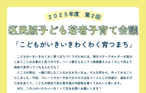 催し物一覧 セルフケア講座 産前・産後のセルフケア講座開催情報や参加の申込みはこちらから 区民版子ども若者子育て会議 2026.01.07 2025年度 第2回 区民版子ども若者子育て会議 「こどもがいきいきわくわく育つまち」(1/15) 赤ちゃん体験授業 2025.07.18 赤ちゃんを連れて学校へ行こう!~令和7年度 親子ボランティアの募集~(受付終了)次回3月予定