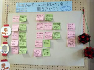 などの質問や困りごとに、あんすこさんや皆さんから、分かる〜!と共感の声や、こうしたらいいんじゃない?とアイディアがでてきたりと、活気のあるおしゃべり会になりました!