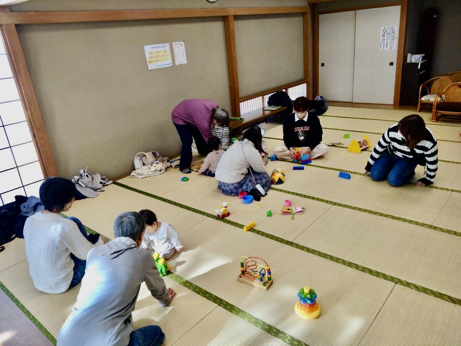広い畳のお部屋で、子どもたちはいろんなおもちゃで元気に遊び、赤ちゃんの泣き声もみんなで見守りながら過ごしました。
