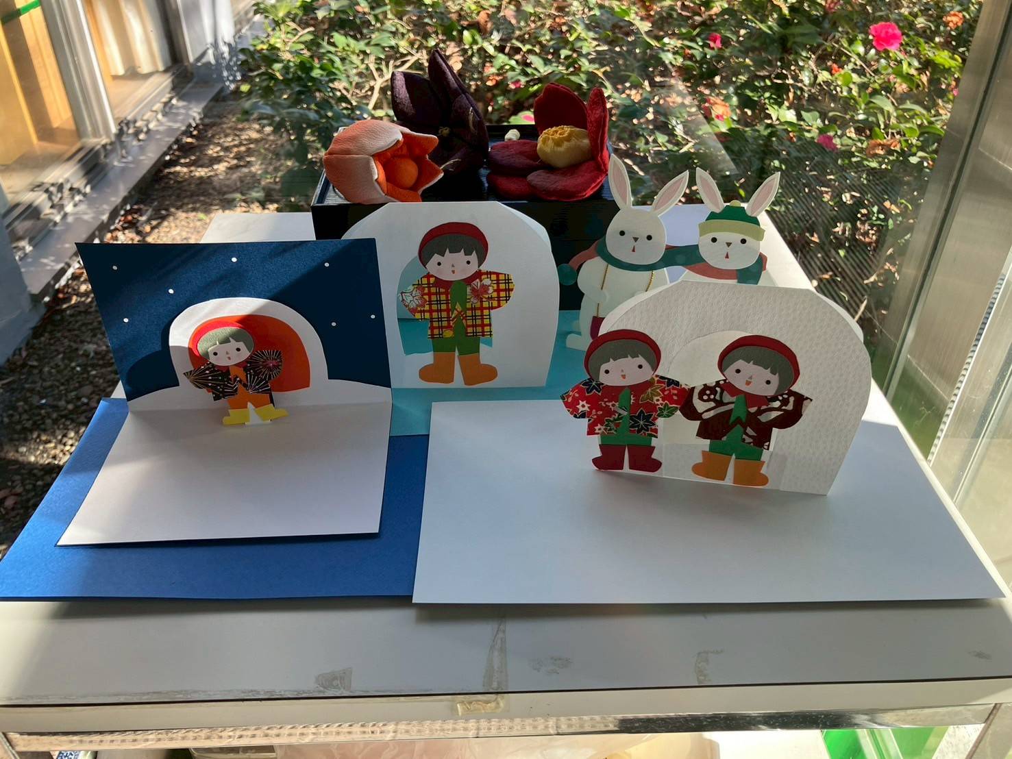 ぶんぶくテラマチの入口(玄関)には、季節ごとのステキな切り絵があります。ひとつひとつが、ていねいな作りで、物語が浮かんできそうなあったかい作品です。