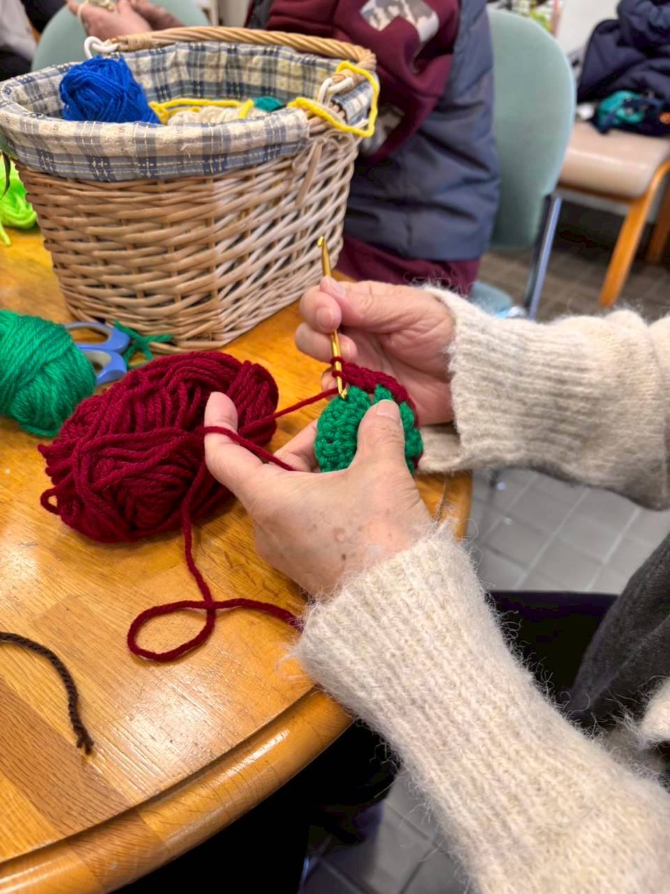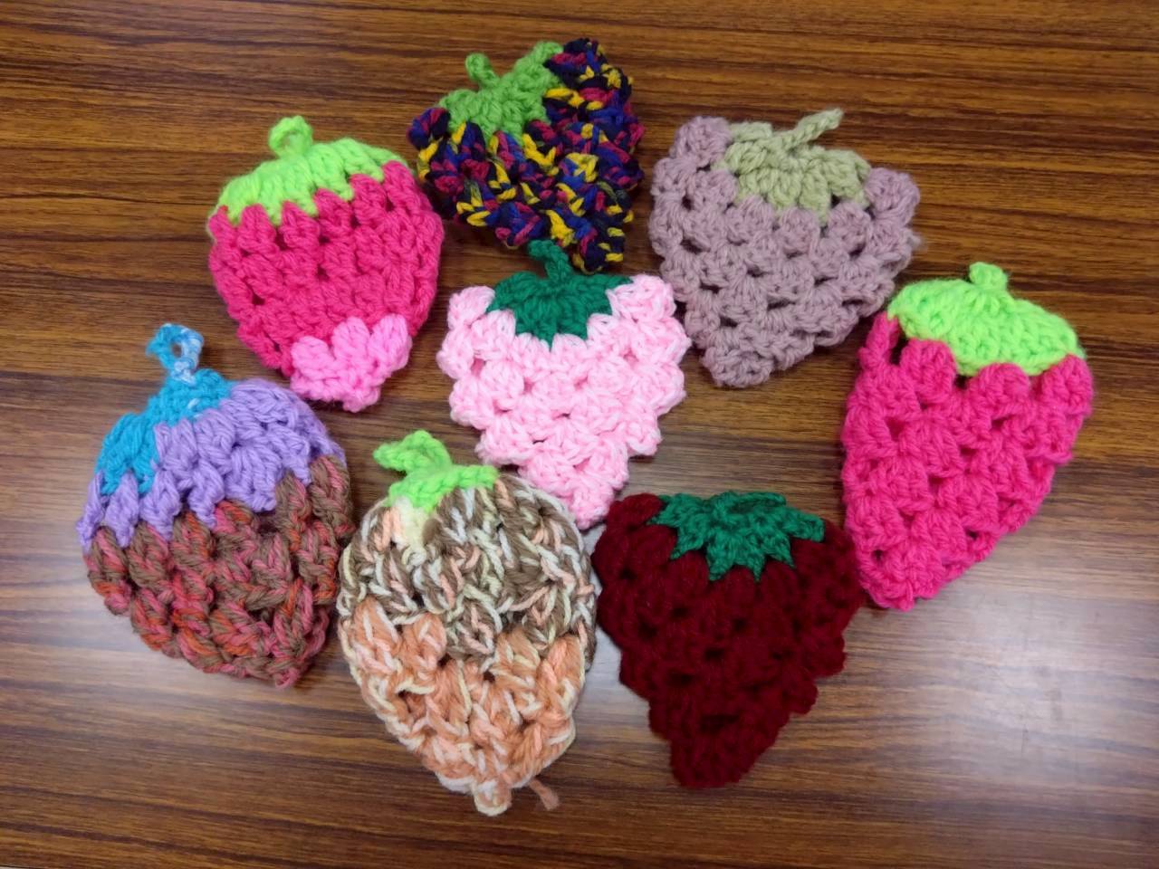 「久しぶりだけど、いちごのアクリルたわしを作りたい!」と張り切って編み始めた方が、おしゃべりを楽しみながら見事に完成させました。