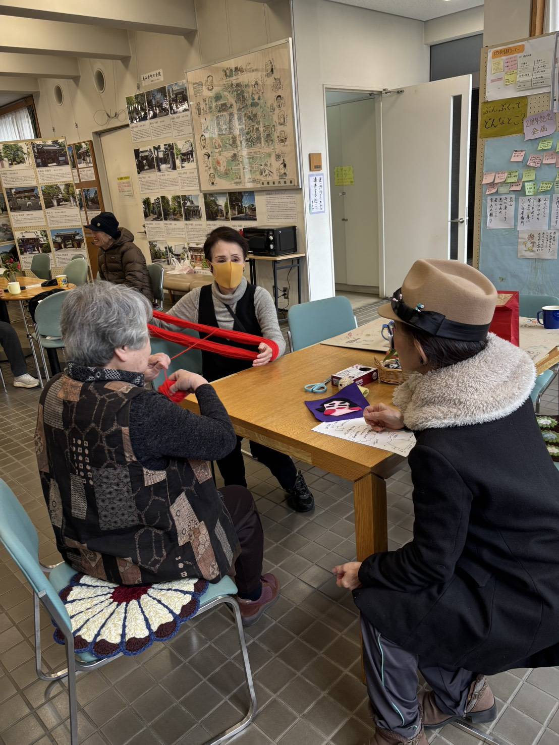 今では珍しい“かせ”の状態の毛糸があったので、みんなで協力して毛糸玉に巻き直しながら、