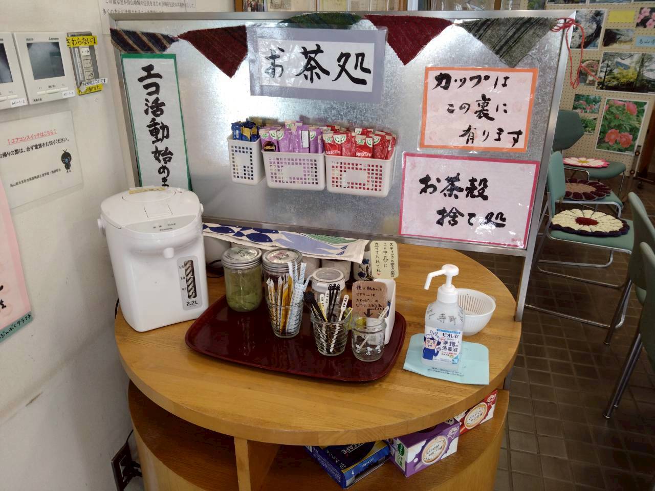 こちらは無料でお飲みいただけますので、貸し出しのカップか、マイカップをご持参のうえご利用ください。