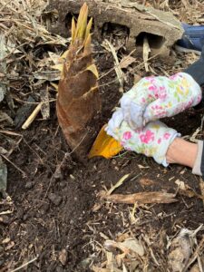「今年もタケノコが顔を出しましたよ〜」と、近所のお寺さんの住職さんよりお声がけしてもらい、ぶんぶくのみなさんで張りきって掘りに行きました!
