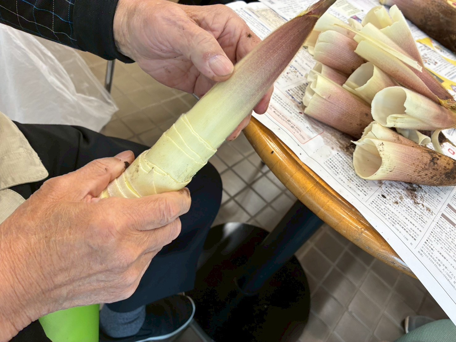 掘れたタケノコは、居場所にいた方たちで、皮をむいて茹でておいて、帰ってきたタケノコ掘りチームと一緒に美味しくいただきました!