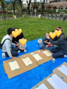 お互い初めましてで写真を撮り合うパパ、ママさん達、ぶりっじはたけのお野菜🌱にお水をあげる子ども達・・