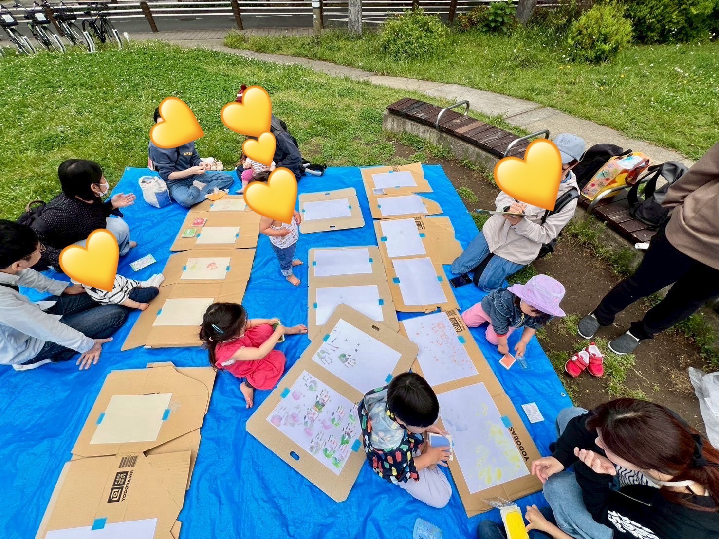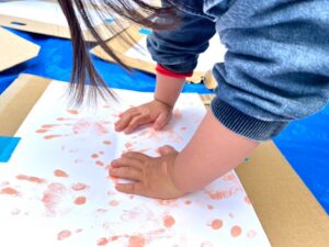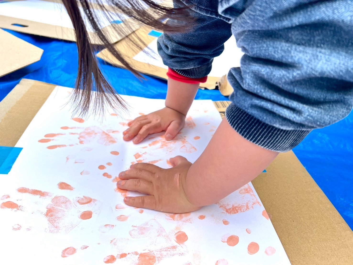 初めての手形にびっくりの赤ちゃん、楽しそうにペタペタ手形を押す2、3歳さん達(楽しくてお顔に絵の具でアートも☺️)