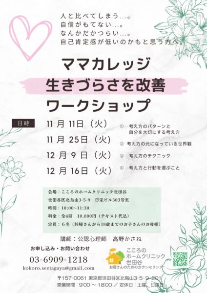 そんな思いをやわらげ、自分を大切にする考え方を学ぶワークショップを開催します。