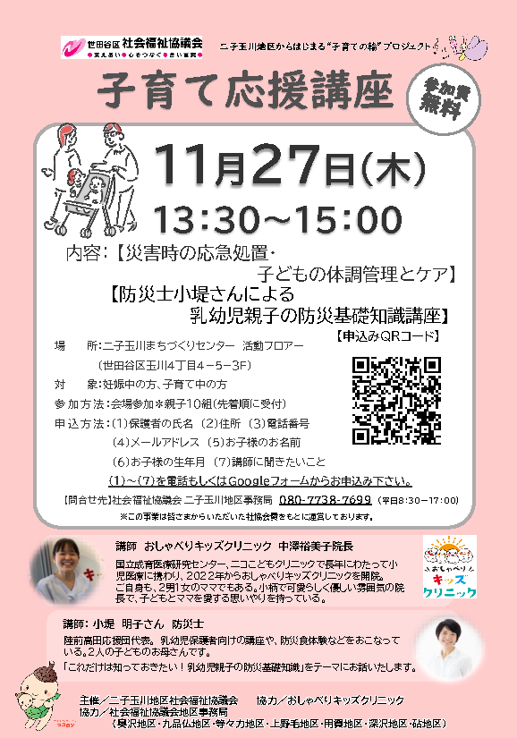 内容:【災害時の応急処置・子どもの体調管理とケア】【防災士小堤さんによる乳幼児親子の防災基礎知識講座】
