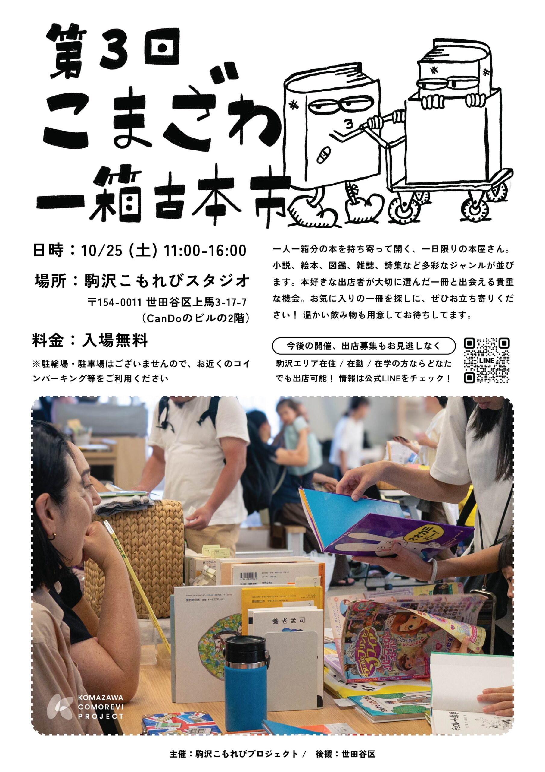 一人一箱分の本を持ちよって、一日限りの本屋さんを開きます。本屋さんが少なくなった駒沢で、出店者が大切に選んだ本を手に取って購入できるチャンスです!こども店長も活躍します!