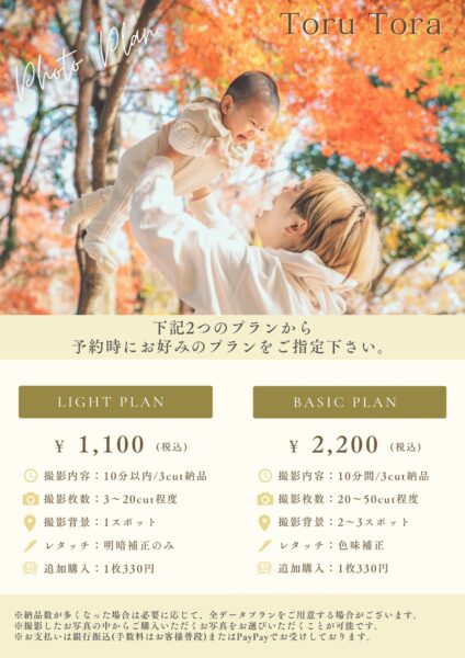 七五三撮影をご希望の場合はベーシックプラン+20分間の撮影延長をお選びいただきご予約いただくようお願いします。(4,400円)