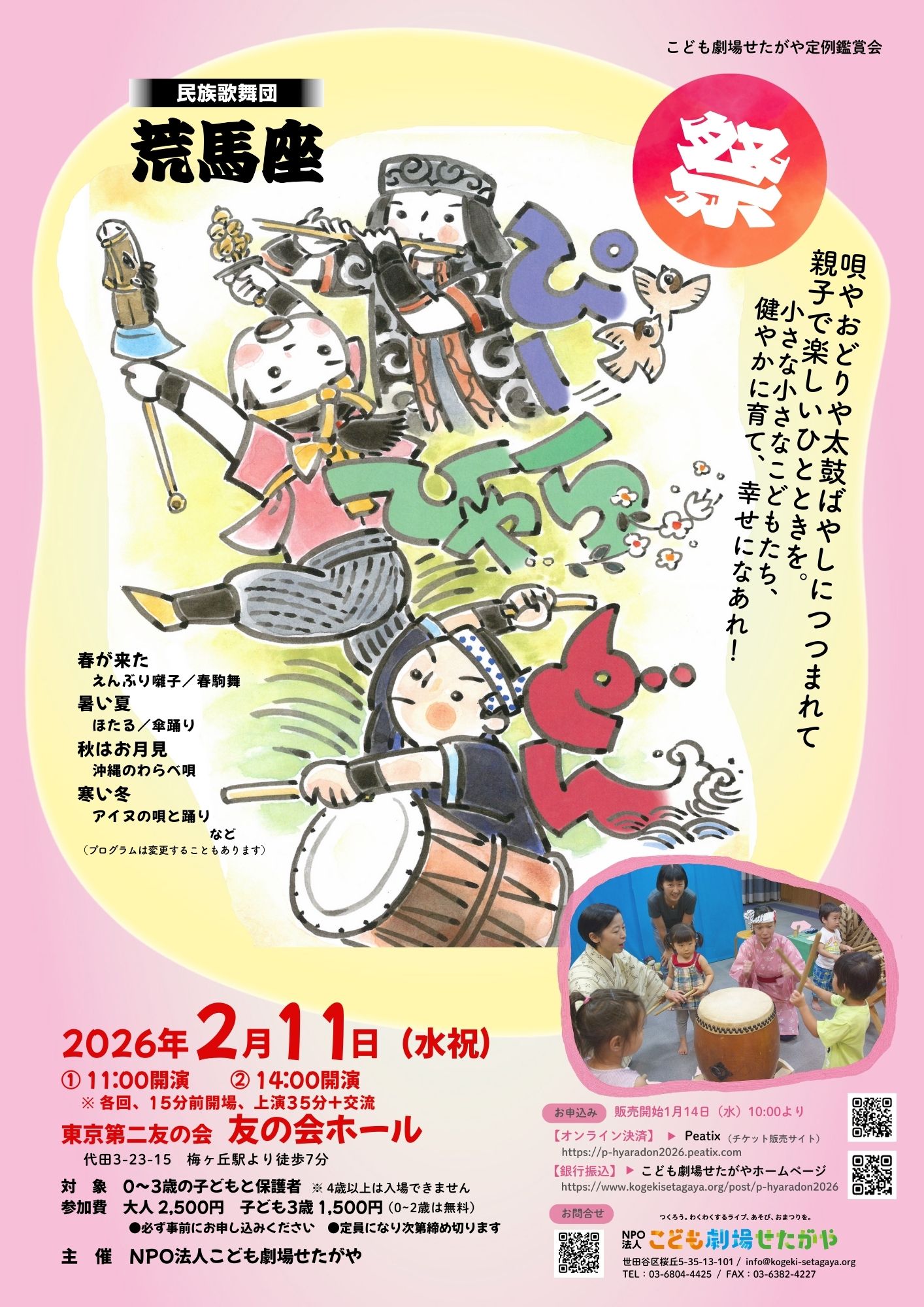 子どもの健やかな成長を願う芸能や行事、子守唄やわらべ唄で構成され、太鼓のリズム、鮮やかな色彩、柔らかな感触など、身体で感じながらゆったりとした時間をお楽しみください。
