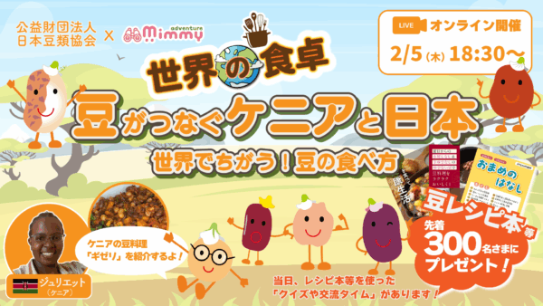 『世界の食卓 豆がつなぐケニアと日本』は、海外の現地ガイドとオンラインで中継をつなぎ、