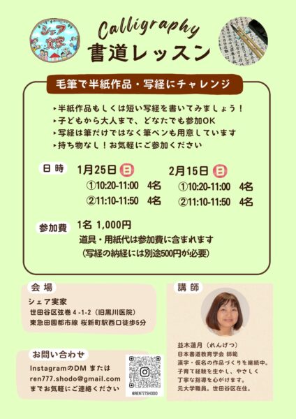書道レッスン!毛筆で半紙作品・写経にチャレンジinシェア実家