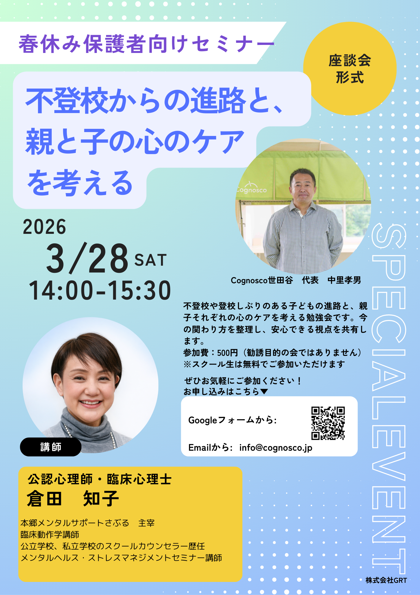今回のセミナーでは、28年間の教員経験を持つ「Cognosco世田谷」代表の中里と、公認心理師・臨床心理士の倉田知子先生をお迎えし、座談会形式で温かみのある学びの場をつくります。