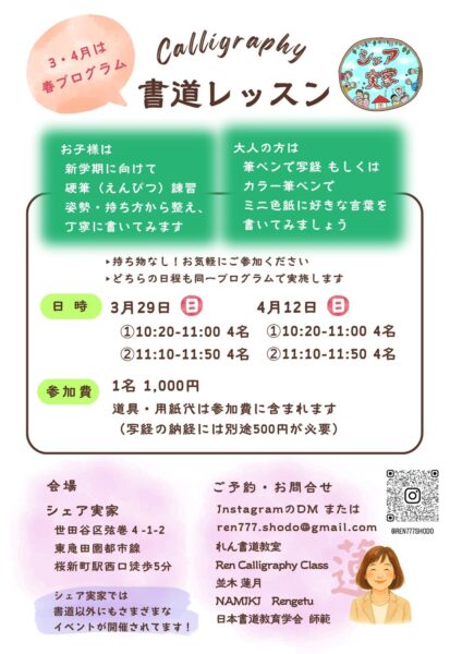 書道レッスン!お子さま向け硬筆や大人向け筆ペン、写経 inシェア実家
